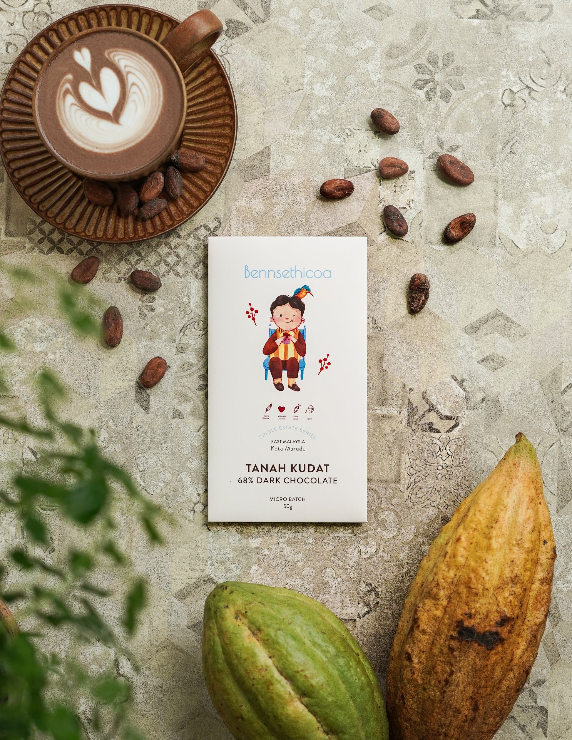 Crafted by Wilfred Ng, founder of Benns Ethicoa Chocolate Factory, Tanah Kudat 68% transforms these exceptional beans into a smooth, vibrant dark chocolate that captures the spirit of Sabah’s land. Honored with a Silver Award at the 2024 Academy of Chocolate, this chocolate is a tribute to the farmers, traditions, and rich soil of Kudat—the true heart of East Malaysian cacao